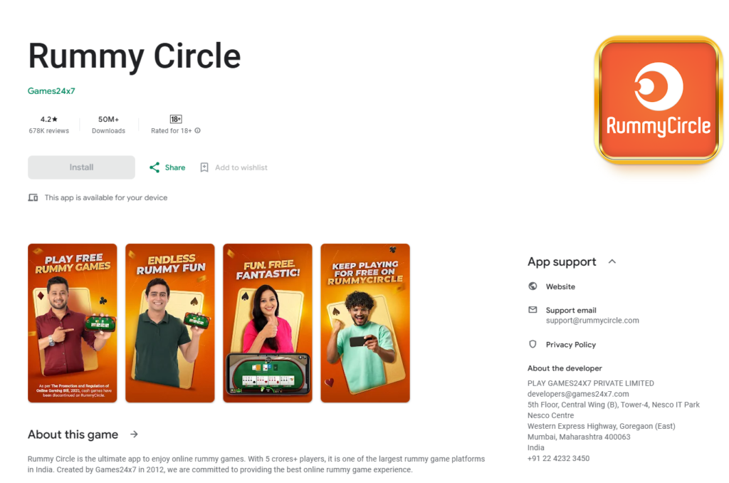 I always open the Play Store listing before I tap Install. On the RummyCircle Play Store page I confirmed the developer is Games24x7, checked install numbers, and scanned permissions. That quick check caught one weird mirror I nearly installed — the package size didn’t match. If you want a clean rummy 11 circle app download, use the Play Store verification step I used.