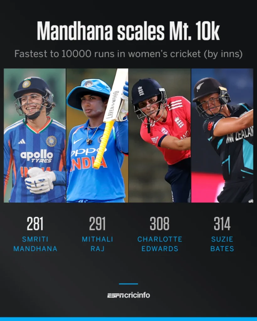 Mandhana’s achievement reflects not only longevity but also sustained excellence across formats. Reaching such a landmark in fewer innings than any other woman before her highlights the impact she has had at the top of the order for India Women over the last decade.