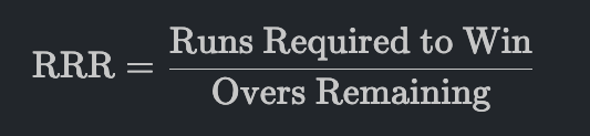 The Required Run Rate is mathematically calculated using a simple quotient that quantifies the pressure on the chasing team: