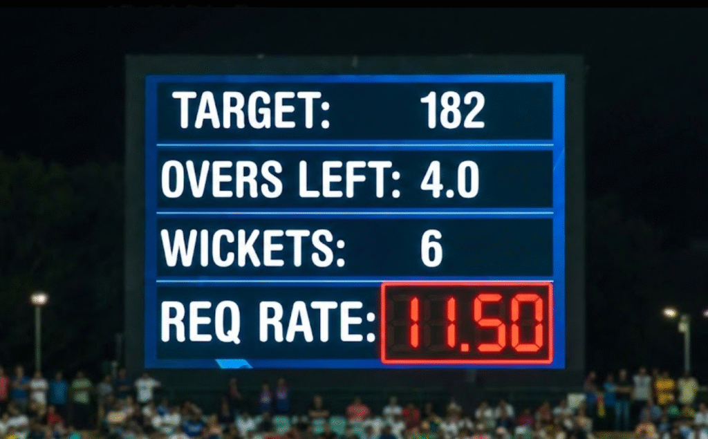 - T20 Cricket (20 Overs): T20 matches necessitate aggressive scoring, as the average run rate is typically between 8 and 9 runs per over. A required rate consistently settling between 10.5 and 12.0 RPO presents a major challenge, requiring sustained aggression outside the Powerplay. Any RRR spiking above 13–14 RPO demands near-perfect, extreme power-hitting execution. It is noted that, in modern cricket, “no required run rate is too high”.